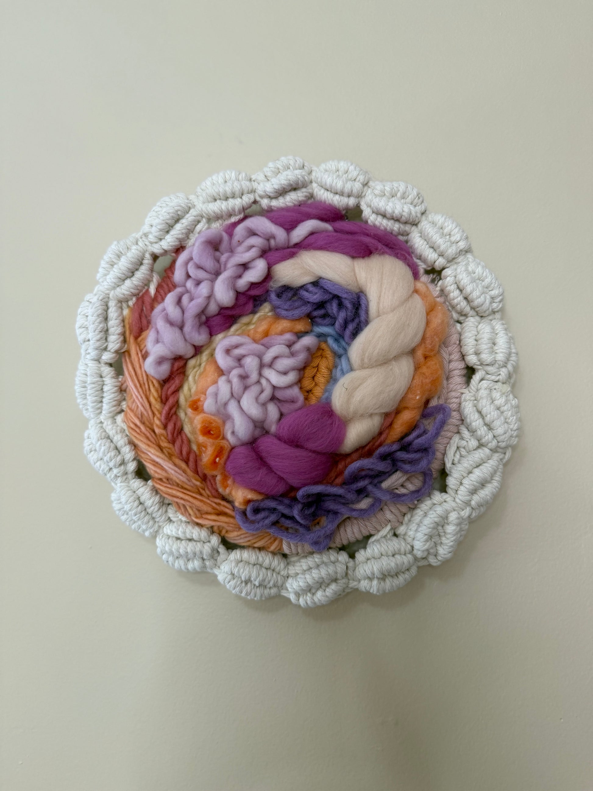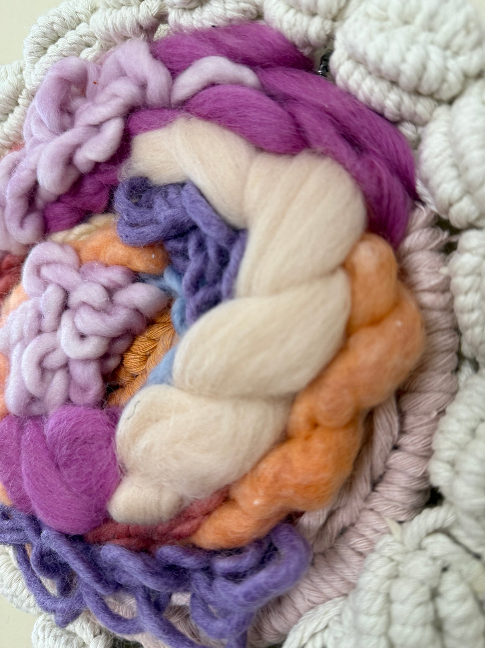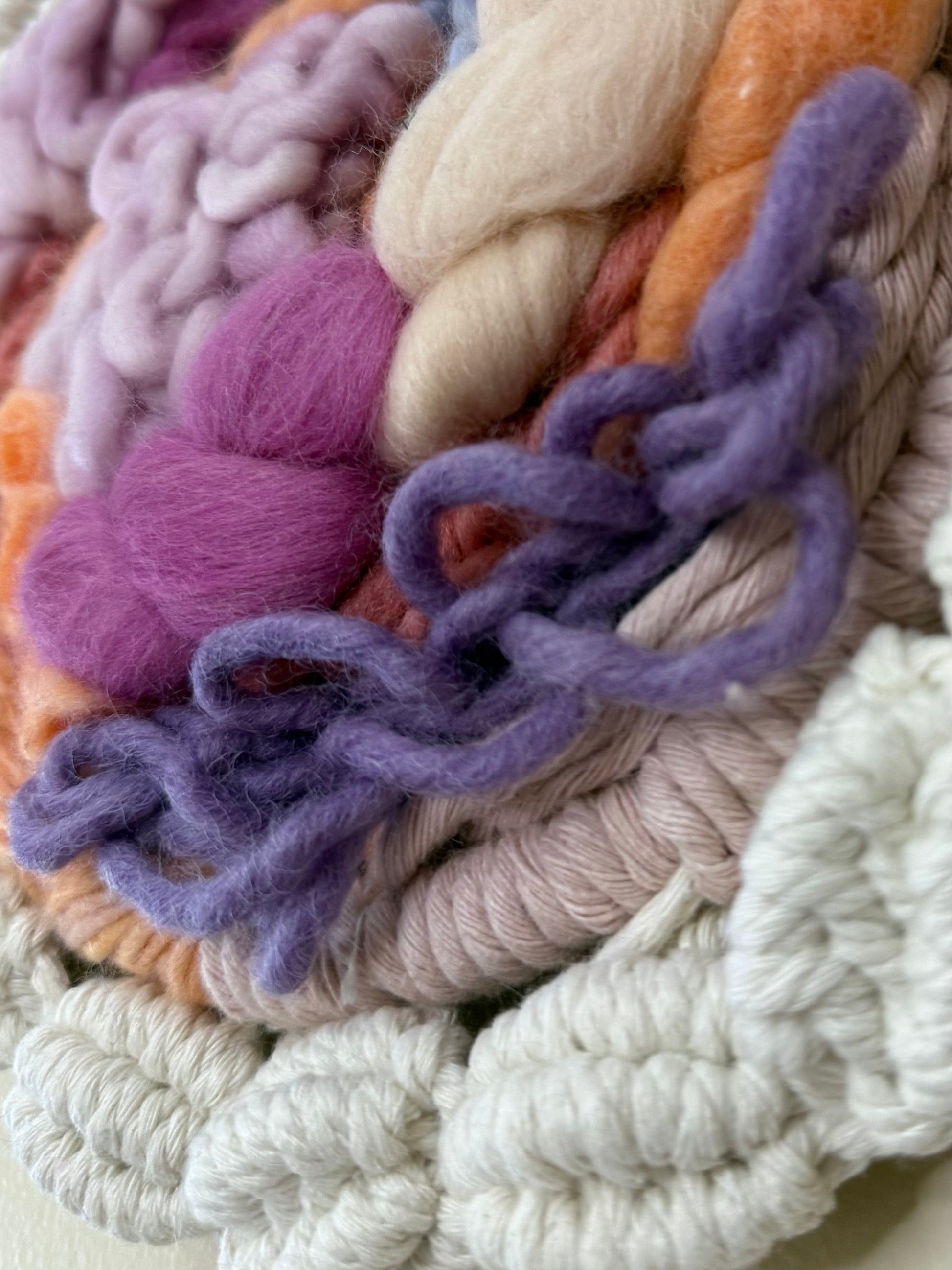 This original fiber artwork, Blushfield, is a hand-woven wall sculpture that blends sculptural form with painterly color. Layers of rope, wool, and various fibers are braided, knotted, and woven together to evoke the delicate juxtaposition where vulnerability become strength.