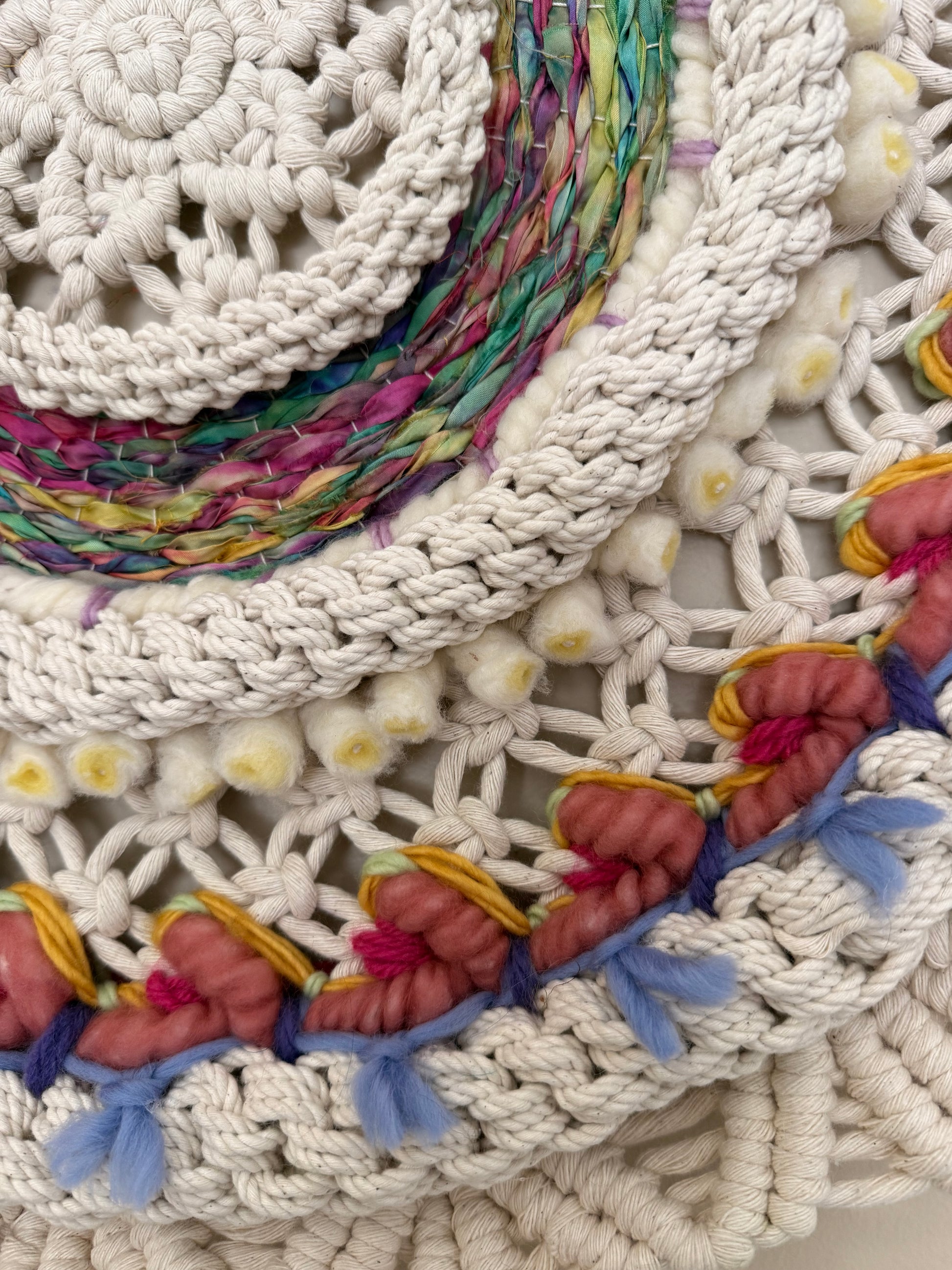 This original fiber artwork, Convergence, is a hand-woven wall sculpture that blends sculptural form with painterly color. Layers of rope, wool, and various fibers are braided, knotted, and woven together to speak to connection: of people, of memories, of forces, of time.