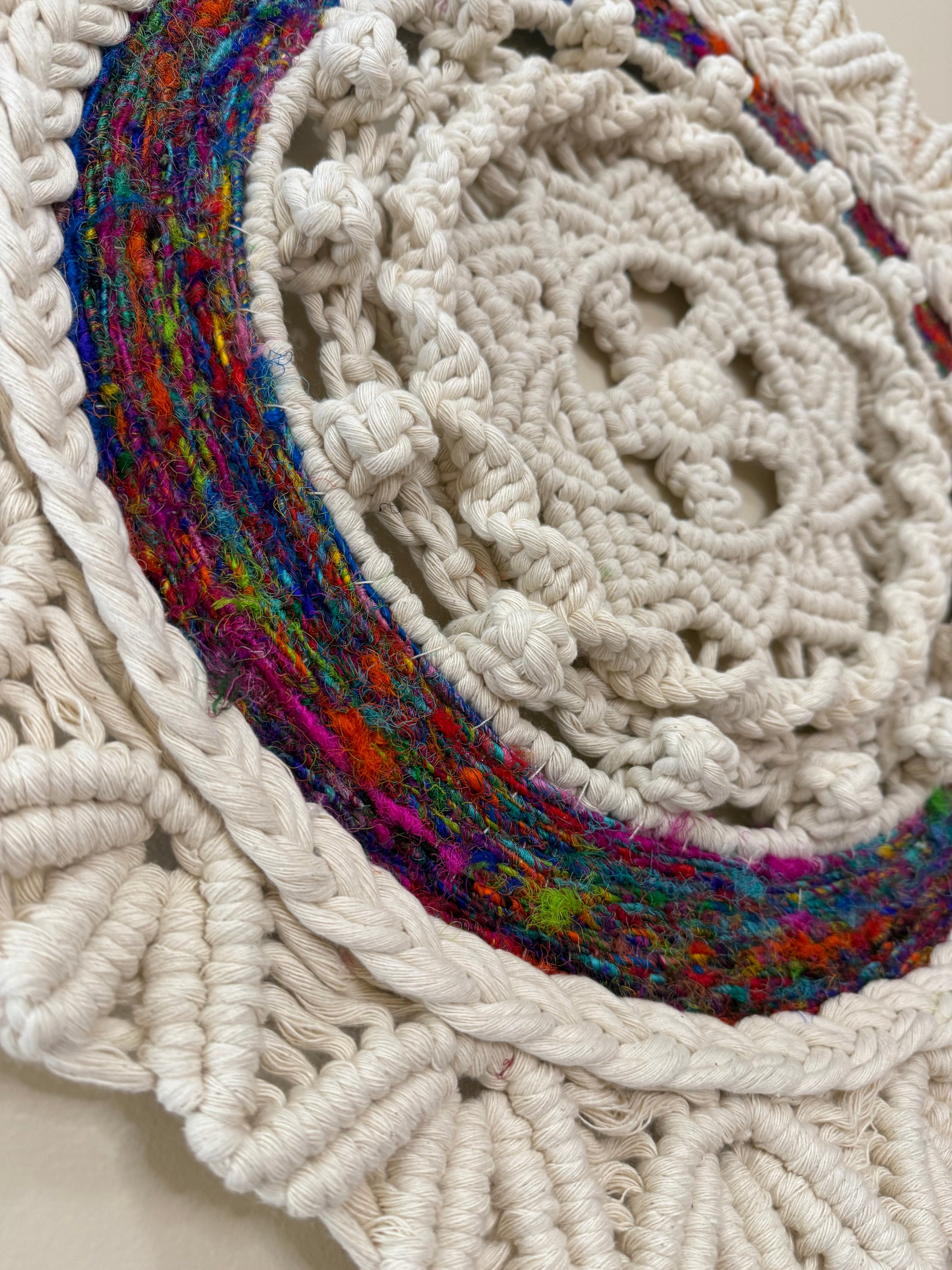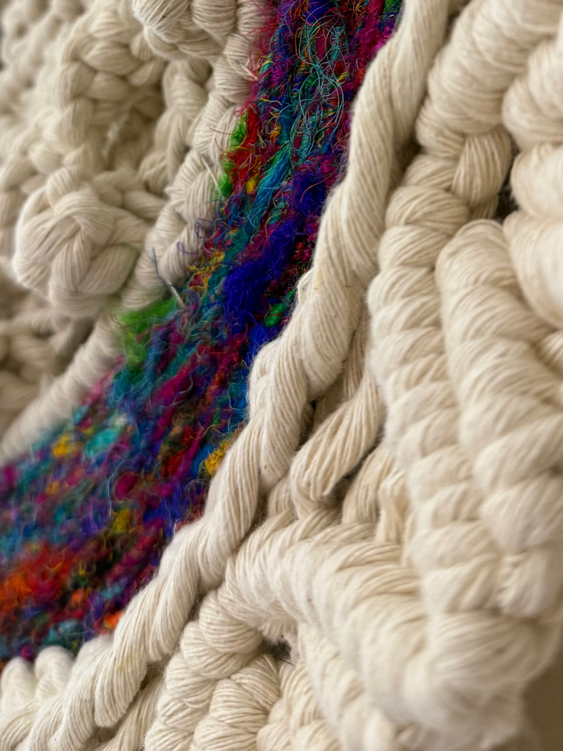 This original fiber artwork, Fractured, is a hand-woven wall sculpture that blends sculptural form with painterly color. Layers of rope, wool, and various fibers are braided, knotted, and woven together to evoke the moment of disruption- the place where something cracks, reveling both loss and a vibrancy with in.