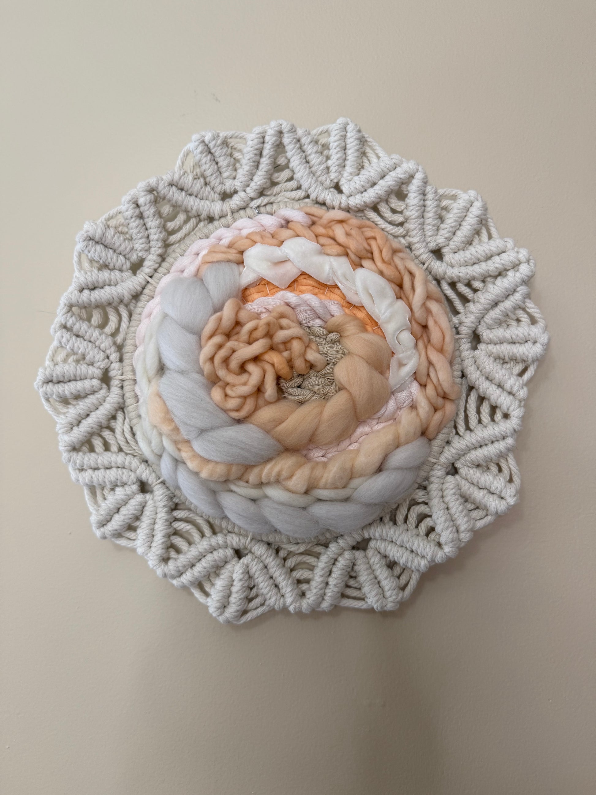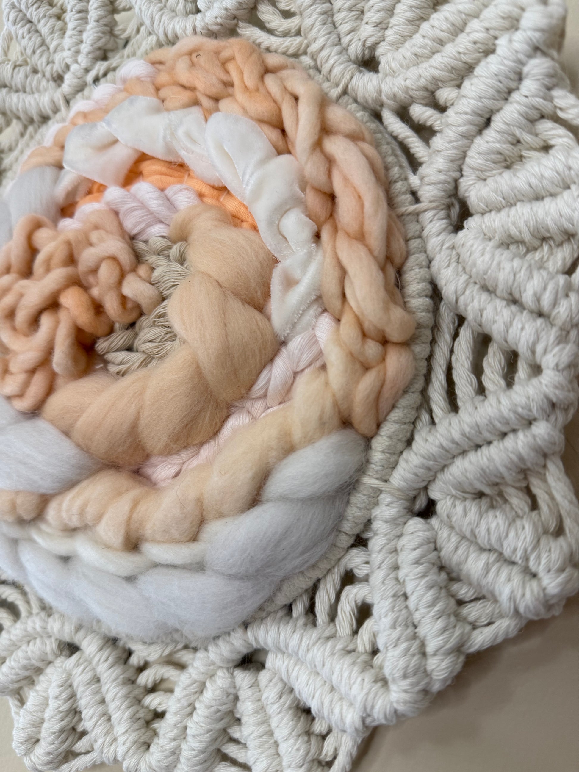 This original fiber artwork, Quiet Orbit, is a hand-woven wall sculpture that blends sculptural form with painterly color. Layers of rope, wool, and various fibers are braided, knotted, and woven together to embody quiet revolution-small, constant, indefinite.