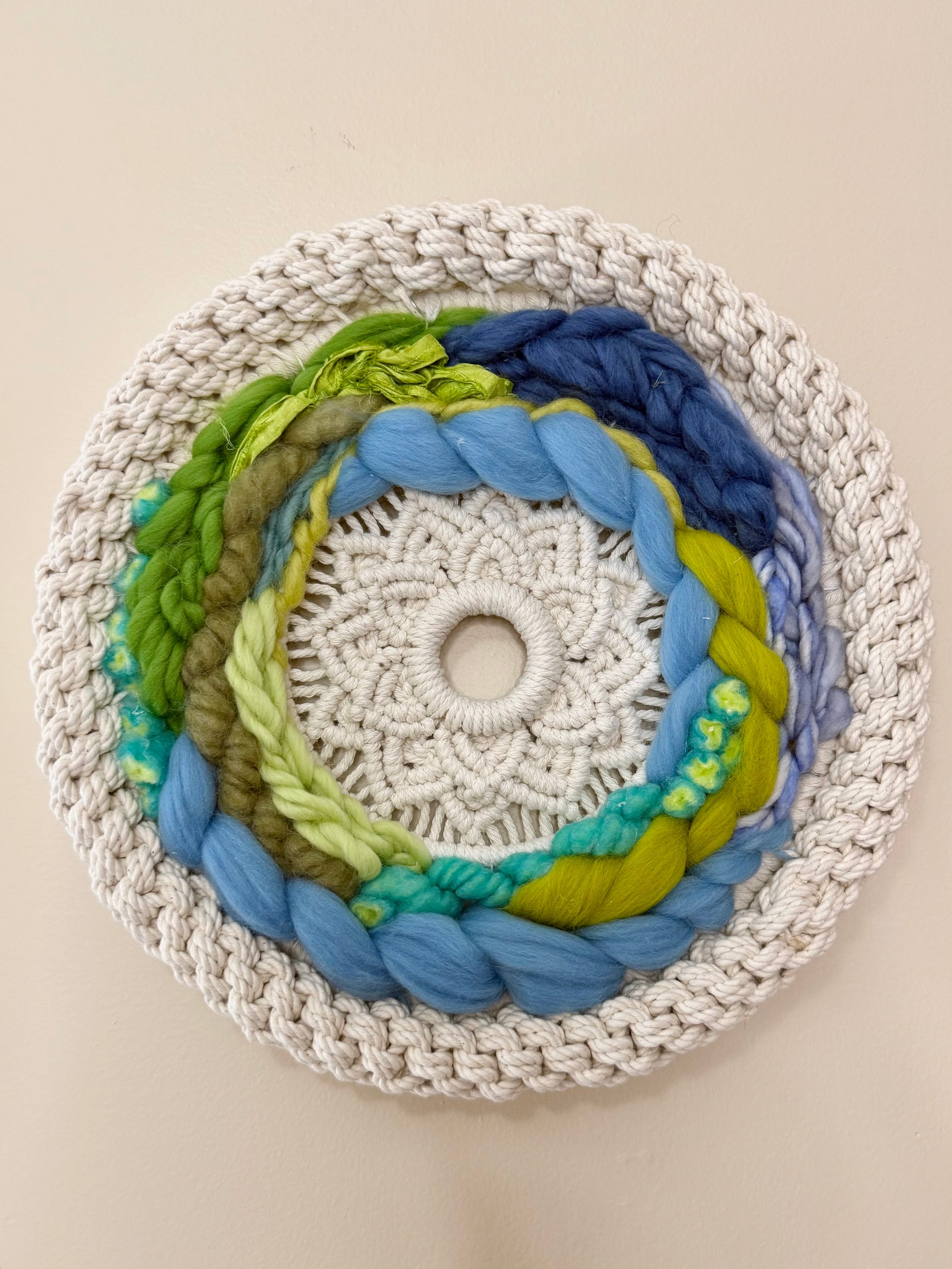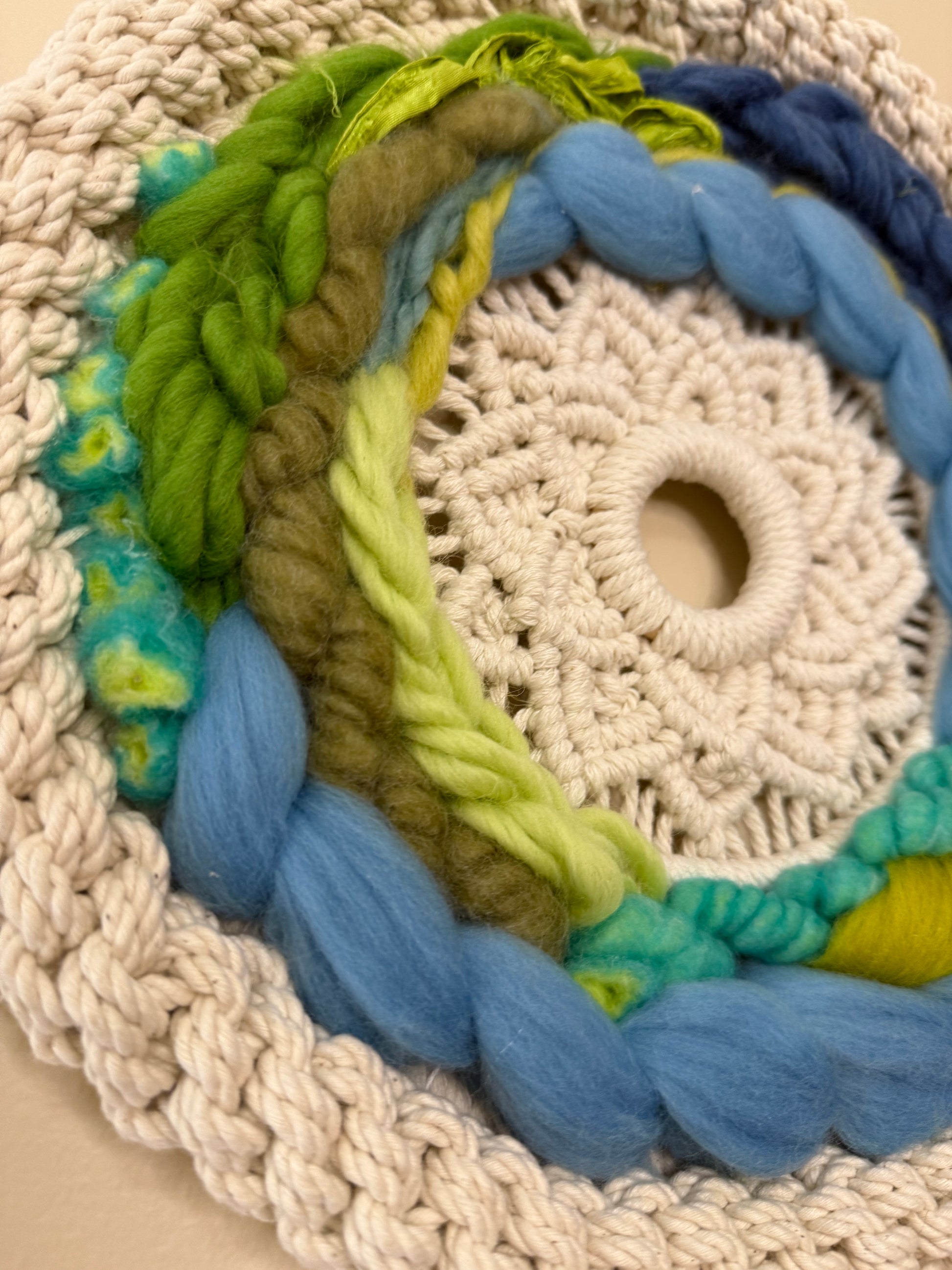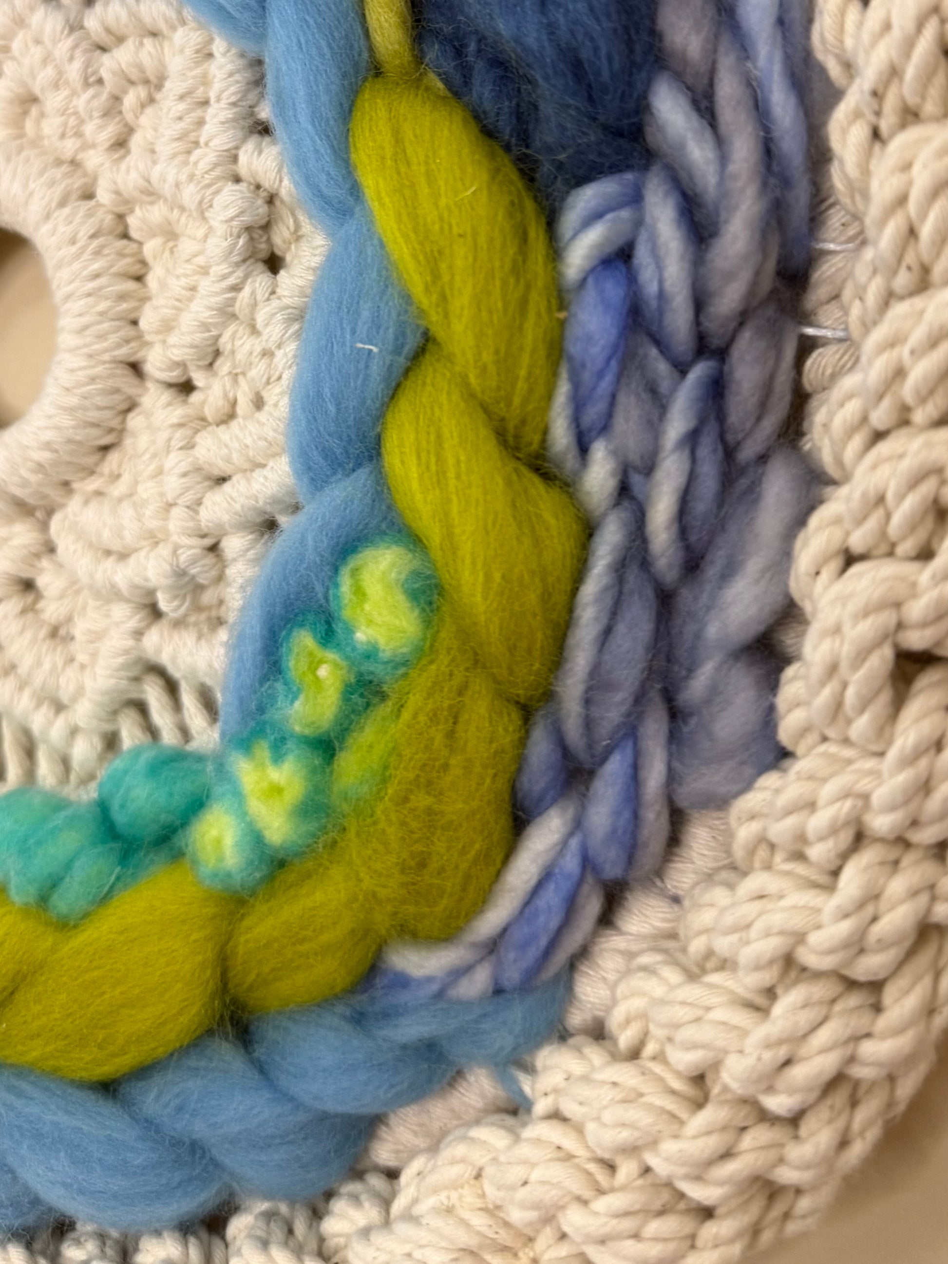 This original fiber artwork, Undercurrent, is a hand-woven wall sculpture that blends sculptural form with painterly color. Layers of rope, wool, and various fibers are braided, knotted, and woven together to evoke the movement of water and shifting landscapes.
